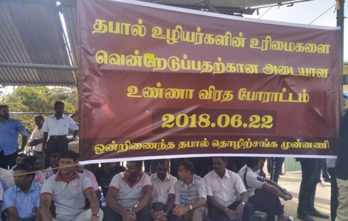 தொடர்ந்து பணிப்புறக்கணிப்பில் ஈடுபட்டுள்ள அஞ்சல் தொழிற்சங்கங்களுக்கு ஆதரவு தெரிவிக்கும் வகையில் இன்று யாழ்ப்பாணத்தில் அடையாள உண்ணாவிரத போராட்டம் ஒன்று முன்னெடுக்கப்பட்டுள்ளது. யாழ்ப்பாணத்தில் உள்ள பிரதான அஞ்சல் அலுவலகத்திற்கு முன்னால் இன்று காலை 7.30 மணியளவில் ஒன்றுகூடிய ஊழியர்கள் தமது அடையாள உண்ணாவிரத போராட்டத்தை ஆரம்பித்துள்ளனர். இதில் சுமார் 500க்கும் மேற்பட்ட யாழ். அஞ்சல் அலுவலக ஊழியர்கள் கலந்துகொண்டுள்ளனர்.