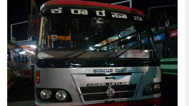 அடித்து நொறுக்கப்பட்ட கர்நாடக பேருந்தின் கண்ணாடி