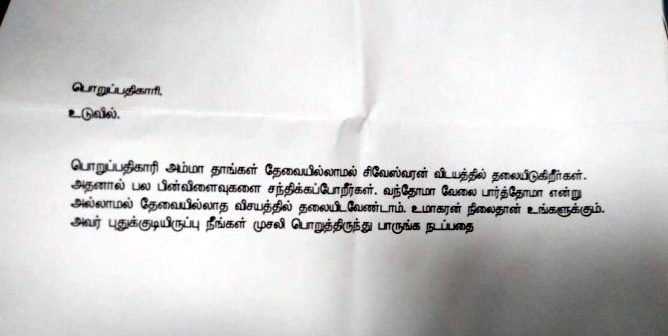 அதில் “அதிகாரியான நீங்கள் தேவையில்லாத விடயங்களில் தலையிட வேண்டாம் அவ்வாறு தலையிட்டால் முன்னர் இருந்த பொறுப்பதிகாரிக்கு நடந்ததே உங்களுக்கும் நடக்கும்” என எச்சரிக்கை விடுக்கப்பட்டுள்ளது.